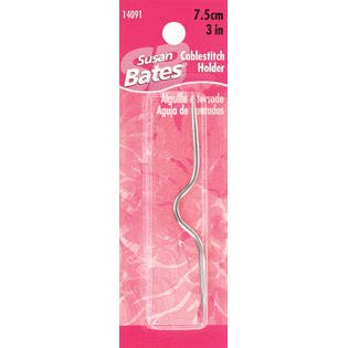 The HandiTool is a 4" tool with a crochet hook on one end and a knitting needle (size 3) on the other with a finger flat in the middle. Tool comes in six vibrant colors-red, green, gold, blue, yellow and fuchsia. Great for picking up stitches along an edge, picking up dropped stitches, and in a pinch can be used as a cable needle. Every tool bag should have one!