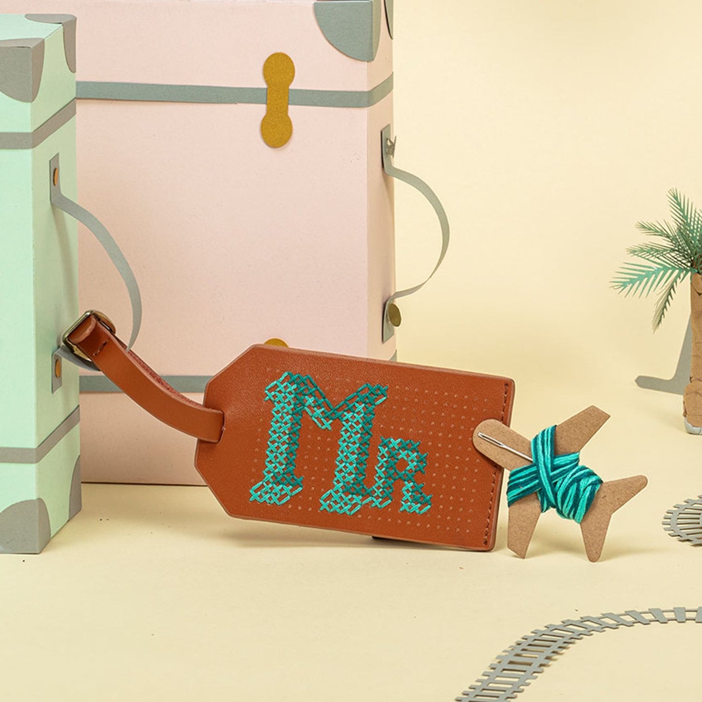Chasing Threads DIY Cross Stitch Luggage Tag Kit - Brown with Teal thread