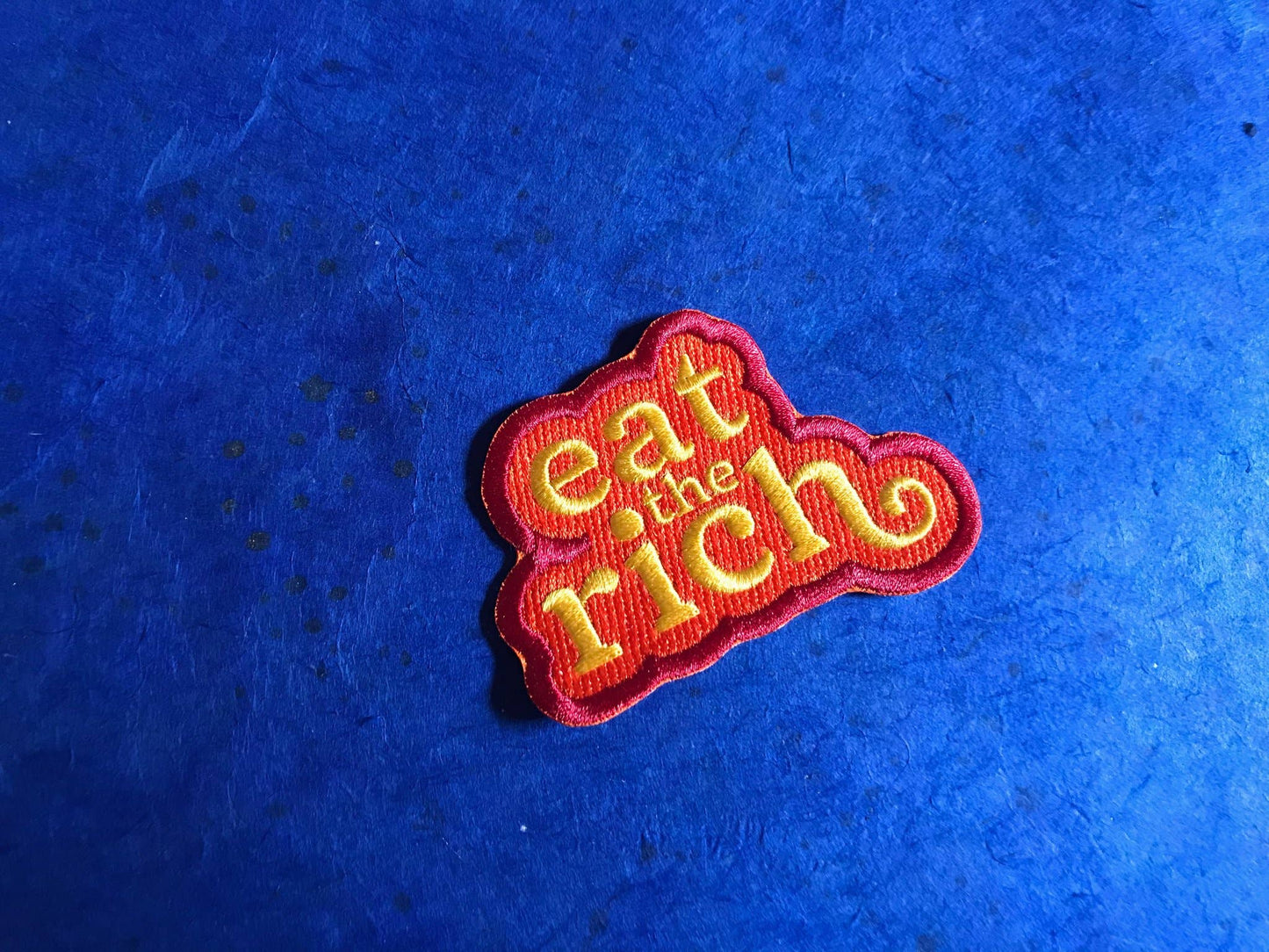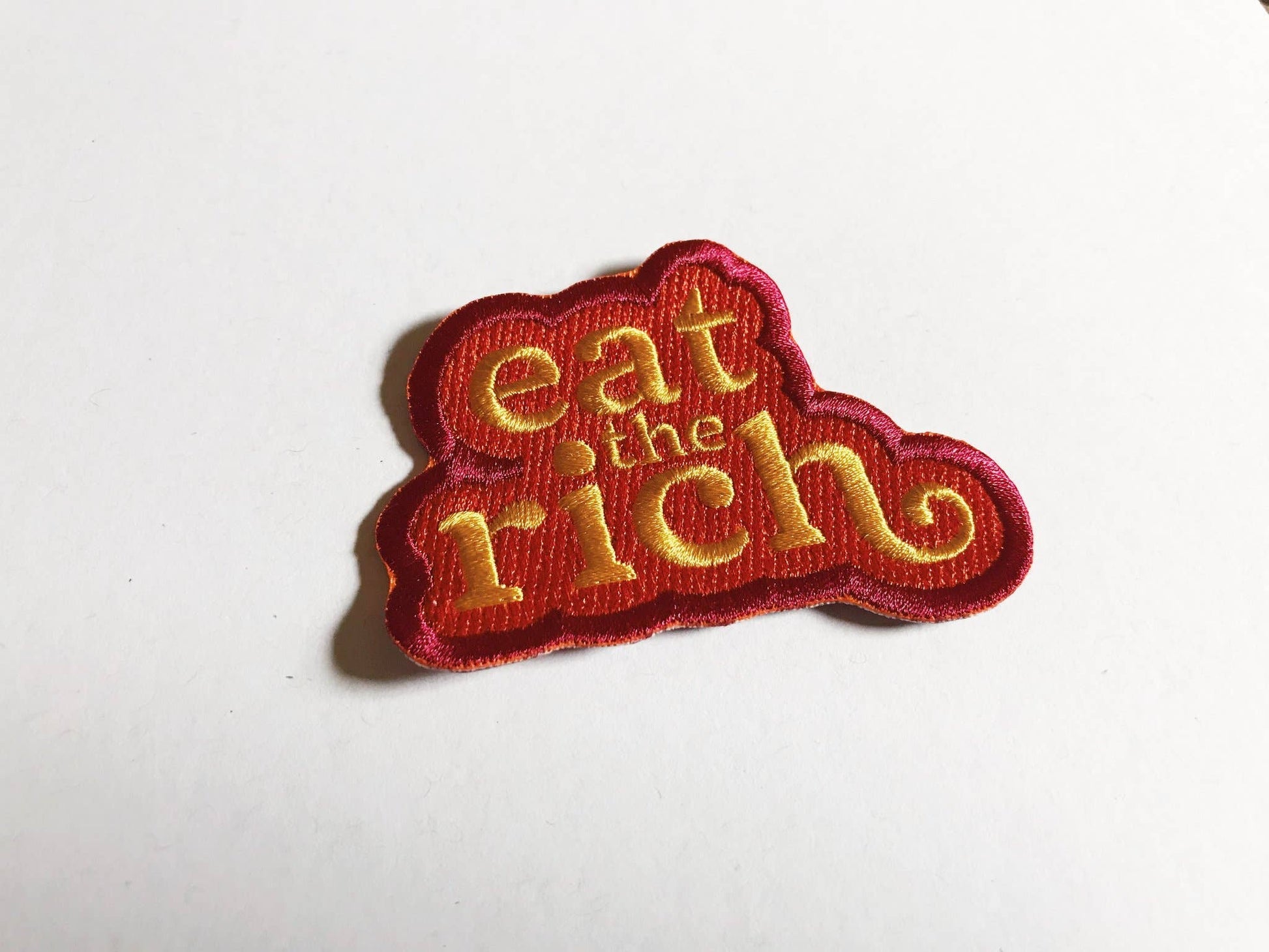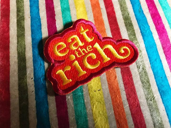 100% embroidered iron-on patch featuring a phrase to live by. If the rich are going to accumulate wealth like dragons, we should be able to slay them and redistribute their hoard. It's only fair.
