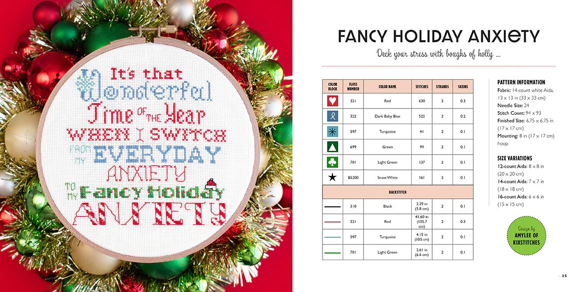 There is no previous experience required here! In addition to simple instructions and clear, easy-to-follow patterns, you get a basic lesson in cross-stitch technique, so anyone can make these designs. Stitch your stress away with a little “Hello Drunk, I’m Christmas” for your door, or make a “Deck the Halls and Not Your Family” for your sibling.