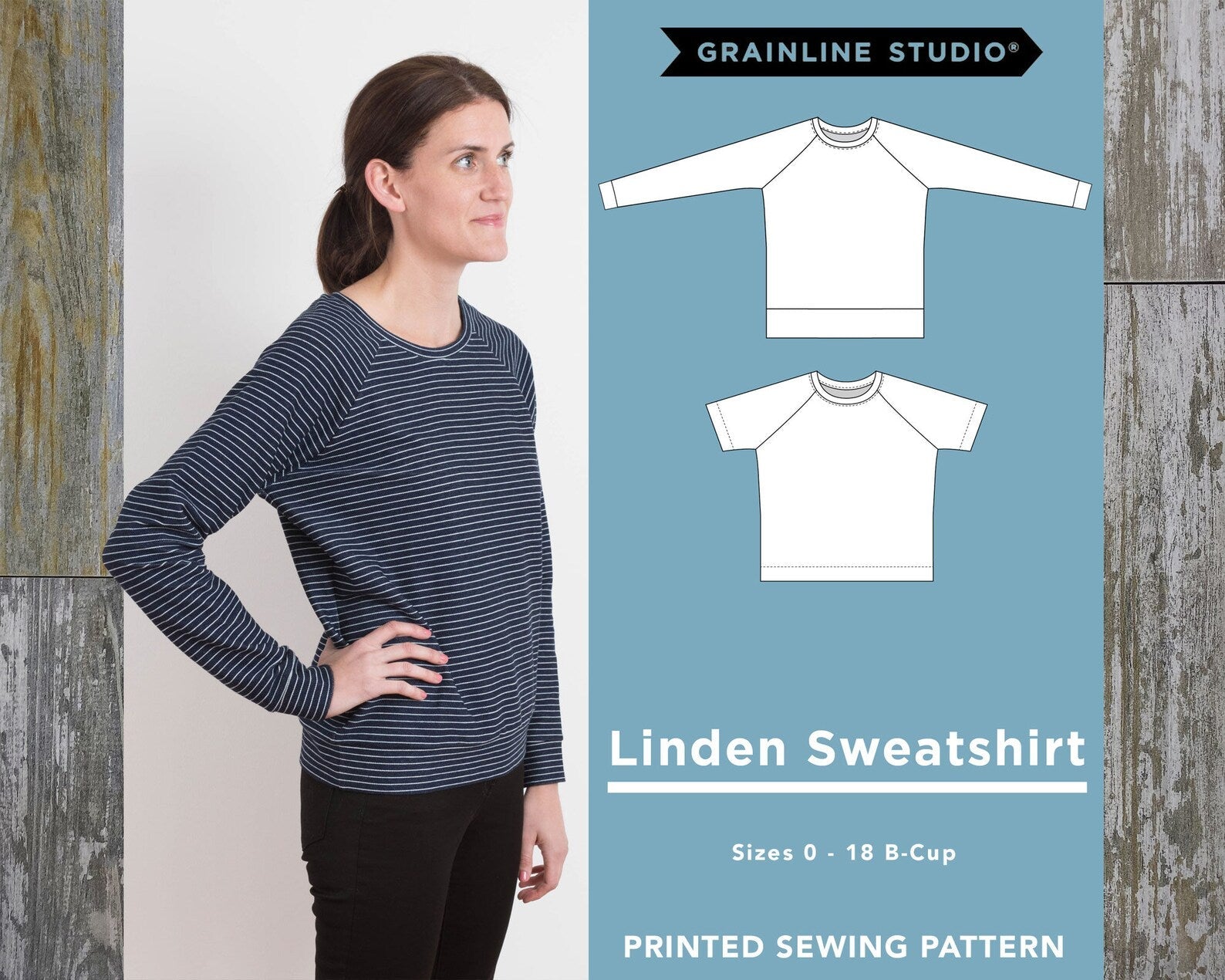 The Linden Sweatshirt sewing pattern from Grainline Studio gives a modern update to the classic sweatshirt. Featuring a relaxed fit, raglan sleeves, and a graceful slightly scooped neckline, this sweatshirt is perfect for fall layering. View A features long sleeves with cuffs and falls to the mid hip with a lower ribbing band while View B hits at the high hip and has short sleeves. You can also mix and match sleeve and body lengths to create multiple versions of this sweatshirt. Detailed step-by-step instructions help you learn all the necessary techniques, including sewing with knits, straight seams, and attaching ribbing.