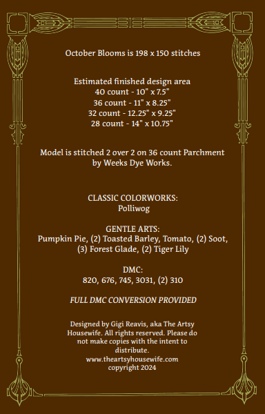 This listing is for a PDf (Pattern Keeper and Markup friendly) pattern of October Blooms, a counted cross stitch pattern by The Artsy Housewife.