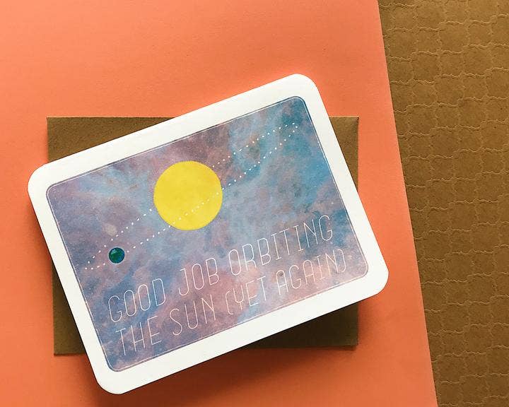 This is an A2 greeting card on light cardstock with rounded edges. The inside is blank and the outside reads "good job orbiting the sun (yet again)"
